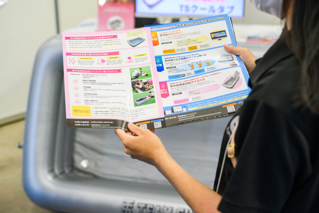 株式会社ユーフォリアは、今回の展示会で「事業者向け熱中症対策プログラム」と「熱中症緊急対応アイスバス」を紹介しました。「事業者向け熱中症対策プログラム」は、1日3回体重測定をするだけで、体重減少率から脱水症のリスクを検知し、アラート通知をするシステムです。担当者は「自分がとるべき水分量がわかっている人は多くありません。体重減少率から必要な水分量がわかるので、水分を摂取する習慣が身に付きます」と説明します。酷暑の作業現場で熱中症が発生した際、重症化を防ぐためには深部体温を迅速に下げる必要があります。そんなときに活用できるのが、氷水を張った「熱中症緊急対応アイスバス」です。2025年から発売し、建設現場などですでに導入されています。
