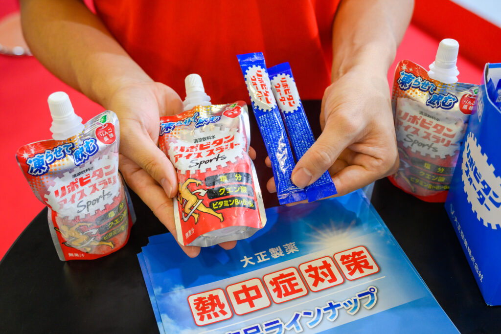 水分の中に微細な氷が分散したアイススラリーは、氷をそのまま飲めるため、深部体温の低下に効果的とされています。大正製薬株式会社の「リポビタンアイススラリー」はその特性を活かし、さらにクエン酸やビタミンB群、発汗で失われやすい塩分を配合しています。キャップ付きのため、一度に全部飲みきれなくても再冷凍ができて利便性が高く、担当者は「発売から4年目になりますが、毎年、前年の倍以上の売れ行きを見せています」と話します。「リポビタンウォーター」は、500mlの水に溶かすだけで飲めるパウダータイプの商品です。100mlあたり2.6kcalと低カロリーなうえ、パウダータイプなので場所をとらずに保管できる点が好評だそうです。