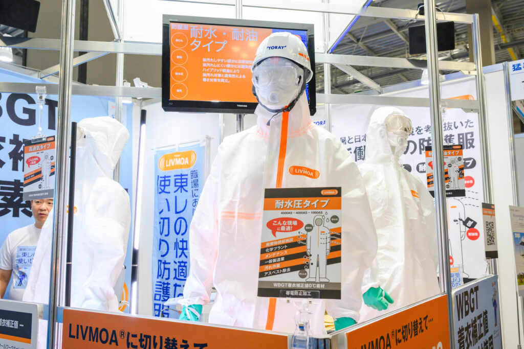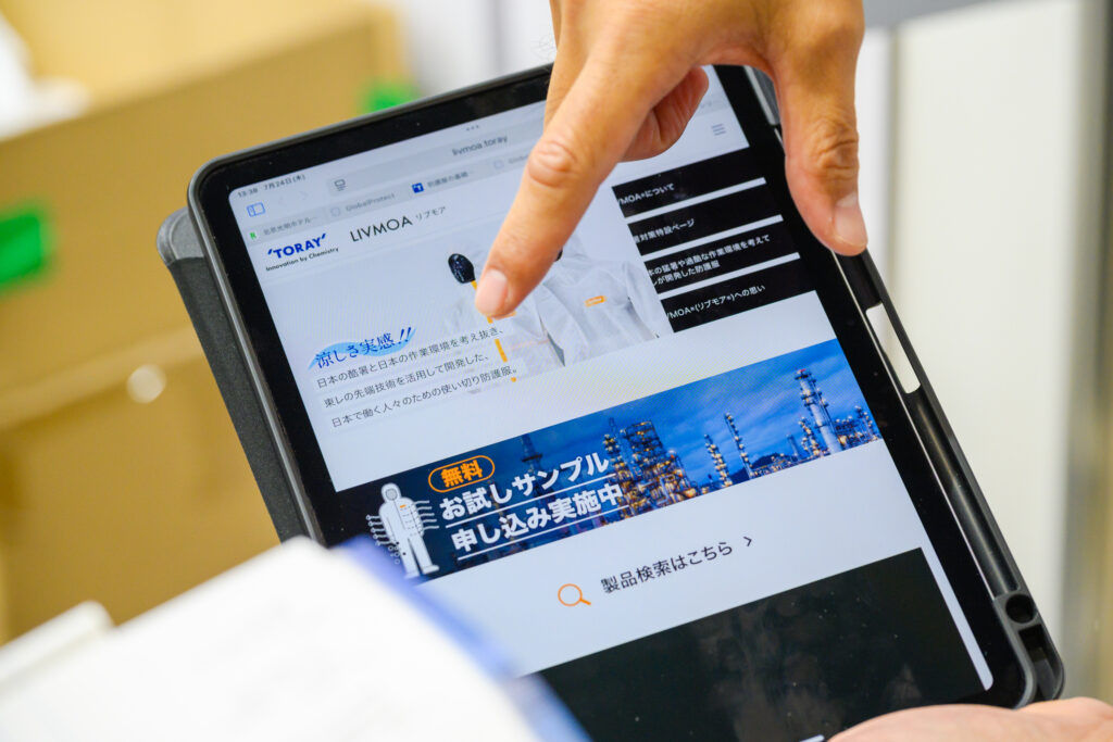 防護服は有害物質の侵入を防ぐため密閉性が高く、防護服を着用する職場は熱中症リスクの高さに悩まされています。そこで東レ株式会社が開発したのが、「LIVMOA🄬」です。粉じんや水、油などすべての有害物質を防ごうとすると通気性が損なわれるため、東レ株式会社はあえて粉じんや水、油と汚れの種類ごとに防護服を開発。たとえば水滴よりも小さい穴が開いた布を使うことで、空気は通すものの水は通さない防護服が実現しました。「経験や技術力を活かし素材を使い分けて開発しました」と、担当者は胸を張ります。性能を実感してもらうため、無料サンプルも用意しており、公式ホームページから申し込みが可能です。