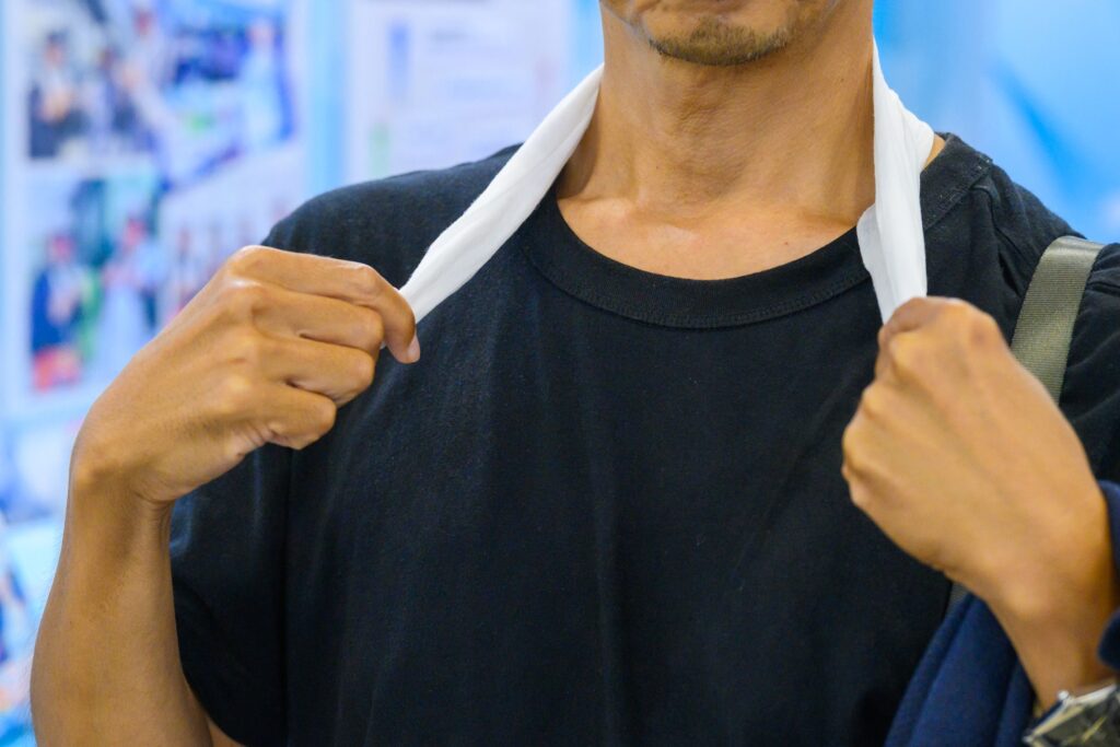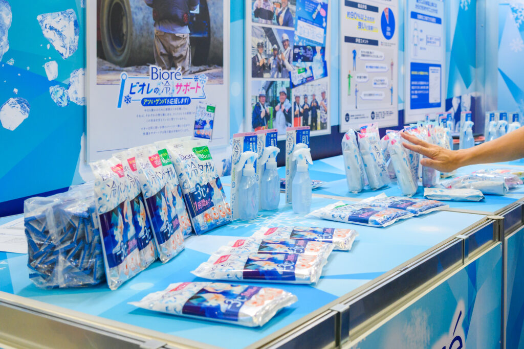 花王株式会社の「Biore 冷タオル」は、冷却ウォーターが染み込んだ厚手シートが個包装された暑熱対策アイテムです。体にのせると気化熱の作用によって、のせる前の肌温度から-3℃の状態が1時間持続します。首からシートを下げたまま作業ができるように、長めにつくられている点が特徴です。担当者は「前もって冷やしておく必要がなく、使いたいときに開ければすぐに使えます」と説明します。そのため、配送業や外回りが多い営業職の方などが持ち歩くだけでなく、テーマパークやイベントなどに持参する人も多いそう。スポーツイベント会場で来場者にプレゼントする事例もあり、さまざまな場面で活用されています。