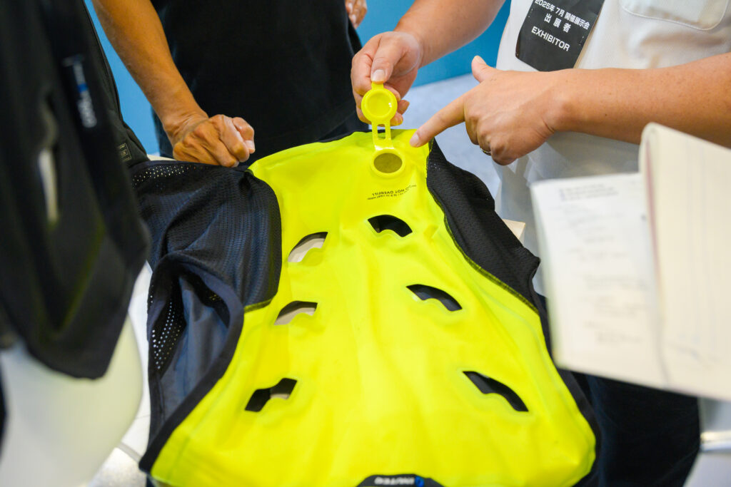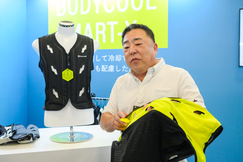 株式会社スリーライクが出展した「BODYCOOL SMART-X」は、ベストに芯材が内蔵されており、500mlの水を入れるだけで水が浸透し、体を冷やしてくれるアイテムです。人は発汗することで体温を調整しますが、ベスト内の水が汗の代わりとなって体の熱を奪い取り、深部体温の上昇を防ぎます。担当者は「ファン付きのベストと一緒に使えば、気化した水により長時間涼しい状態が続きます」と強調します。ストレッチ素材を採用しているので、作業性も確保されています。水があれば使える手軽さと、火気厳禁の職場でも利用できる安全性から、ガス会社や航空会社、電力会社、製造業、ガソリンスタンドまで、幅広く導入されているそうです。また猛暑時、突然災害に見舞われた場合「避難所で充電をしなくても水のみ」で熱中症対策が可能とのことです。