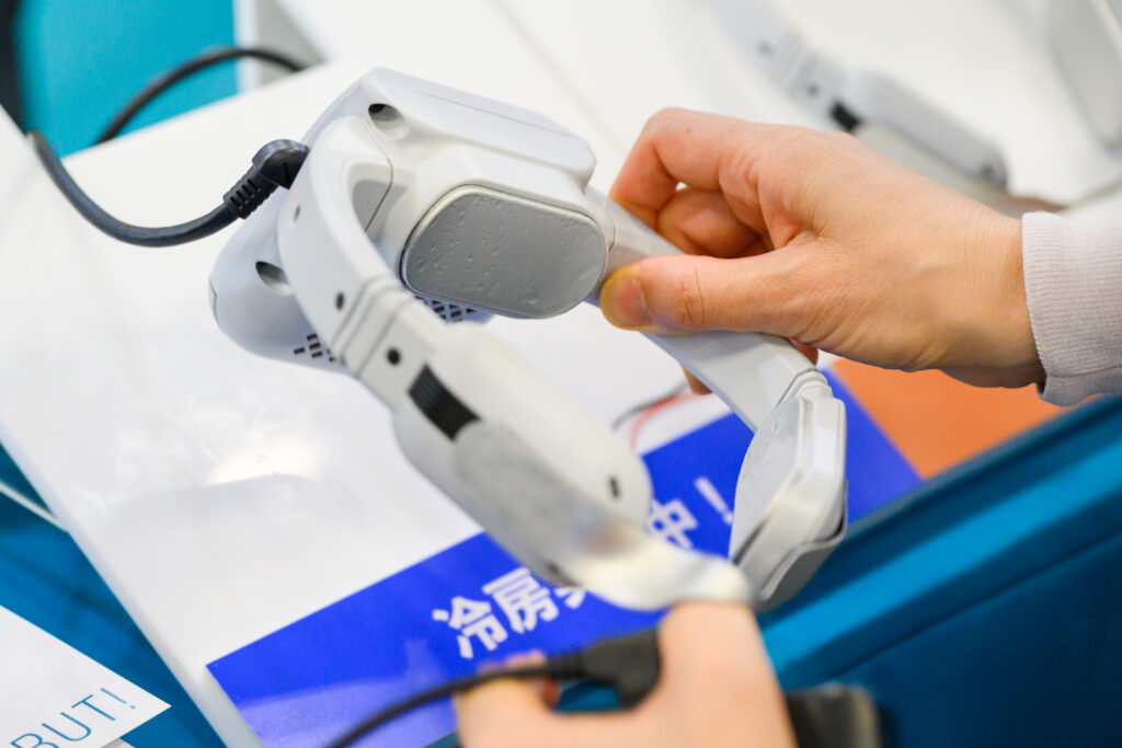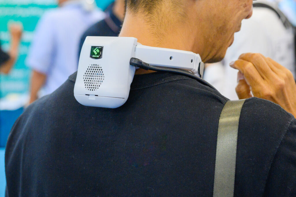 株式会社富士通ゼネラルが展示したのは「ウェアコン」です。担当者は「当社は駅から遠く、通勤時の暑さ対策として技術者がエアコンの技術を活かして開発しました」と振り返ります。本製品は第4世代となり、これまで寄せられた顧客の声を反映しながら改良を重ねてきました。廃熱に水冷方式を採用しているため効率的に熱を逃がすことができ、首元に装着すると頸部など3カ所を急速に冷却し、最大で外部温度に対して-20℃まで冷えます。実際に試した来場者のなかには、あまりの冷たさに驚きの声をあげる人もいました。弱に設定すれば7時間連続して使用可能です。また、冬場は暖房として利用できるので、1年中使えるのもメリットと言えます。専用バッテリー付きで販売されており、鉄鋼業界や建設業界、農業や製造業など幅広い業種で採用されています。