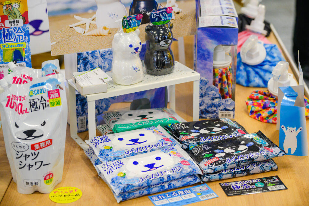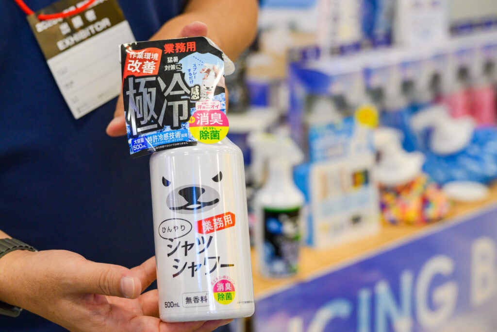株式会社ときわ商会の「ひんやりシャツシャワー」は、雑貨店を中心に販売されている冷感スプレーで、2011年に発売されました。特許を取得した冷感技術により、衣類にスプレーするだけで30分から1時間にほど清涼感が持続します。「リピーターが多く、お客様からは『よく使っているよ』とお声がけいただいています」と担当者は笑みを見せます。ブースでは衣服にスプレーをして、冷感を確かめる来場者の姿も見られました。今年からは業務用を新たに販売。一般用と同じく詰め替えも可能です。さらに、ブースでは「ひんやりふくだけシャワー」も展示されており約30cm×32cmの厚手のシートで、全身を拭いたり首に巻いたりできます。