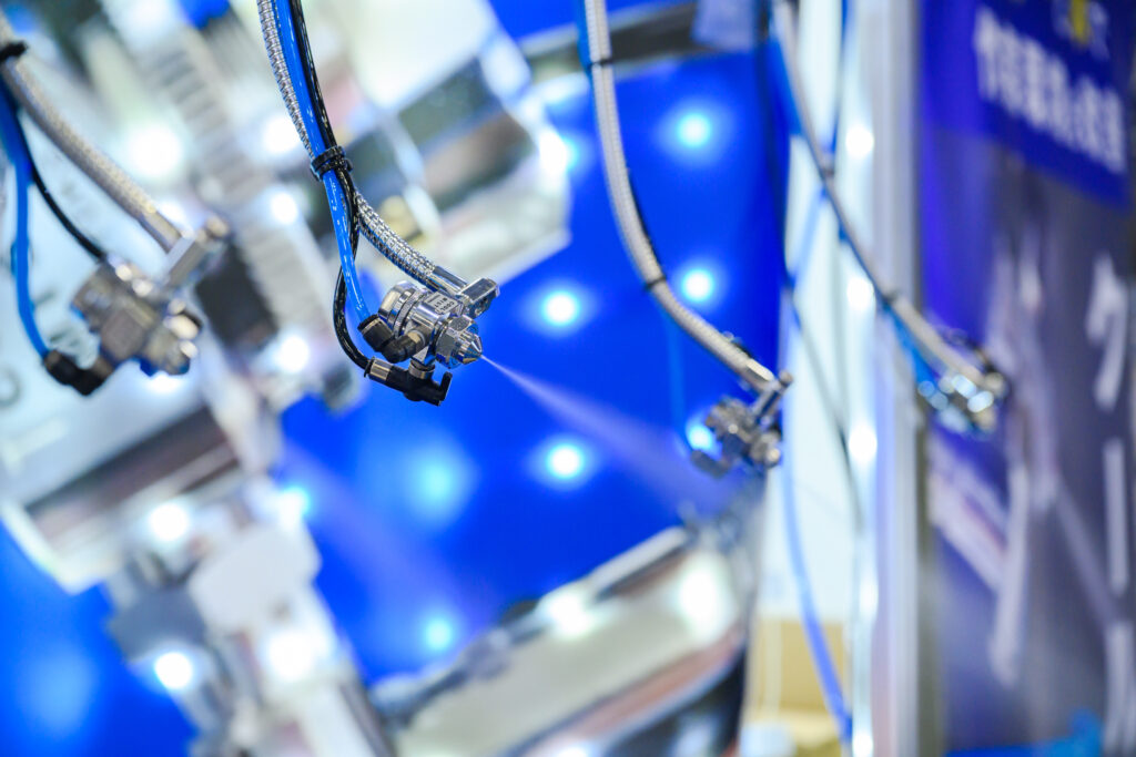 一般的に、ミストを使った暑熱対策システムは水が噴き出るため、周囲や人が濡れてしまいます。東横サポート有限会社の「クールミストLine🄬」は、1分間にわずかティースプーン1杯分の水を細かいミストとして噴射することで、周囲を濡らさないのが特徴です。対象物が濡れないため金属加工工場や印刷工場などでも導入可能です。担当者は「エアーコンプレッサーを使って動かすので、すでにエアーコンプレッサーがある工場では簡単に設置できます」と力を込めます。専門の業者に依頼しなくても、自分たちで設置できるのもメリットと言えるでしょう。電力の使用量も抑えられているため環境にもやさしく、冬場には静電気や粉じん防止にも役立つそうです。